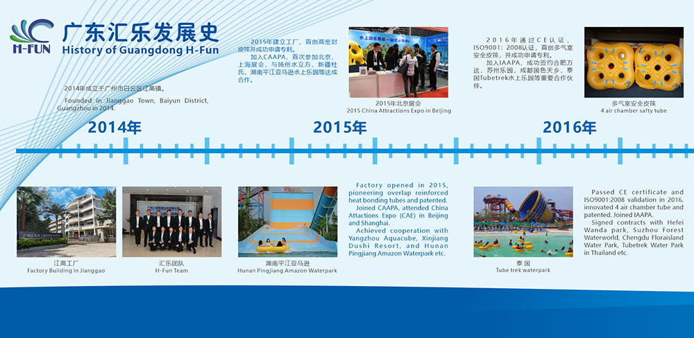 Guangdong H-Fun Water Recreational Articles Company is an experienced manufacturer of water park tubes, rafts, water slide mats, life jackets and other water park products. The company locate in Guangdong, China, with ISO9001:2015 certificate.