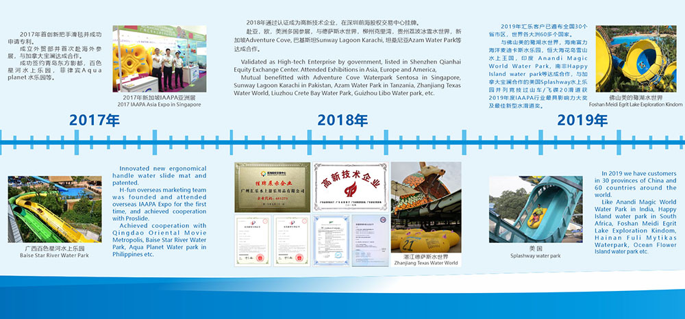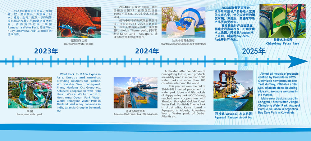 We are member of IAAPA, CAAPA, IAAPI, attended exhibitions in Asia, Europe and America. Thanks for long-term support of our partners like Proslide, WhiteWater West, Atlantis, OCT Group, SUNAC Group, now products of Guangdong H-Fun are widely used in more than 1000 water parks in more than 100 countries. Sincerely hope to cooperate with customers all around the world.